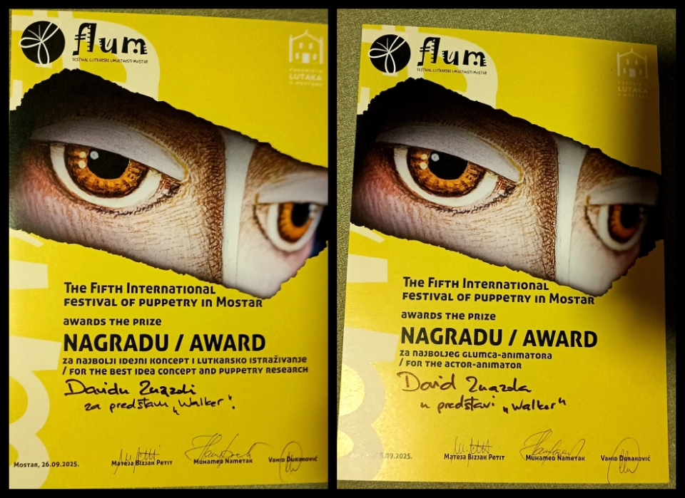 Jury Międzynarodowego Festiwalu Sztuki Lalkarskiej – FLUM w Mostarze (Bośnia i Hercegovina) doceniło Davida Zuazolę jako najlepszego aktora-lalkarza oraz cały spektakl za koncepcję dramaturgiczną oraz twórcze poszukiwania lalkarskiego wyrazu. Marek b. Chodaczyński i Marek Żurawski - współtwócy spektaklu - z całego serca gratulują Davidowi Zuazoli jak również współpracującej przy tworzeniu scenariusza Jelenie Stojanović.